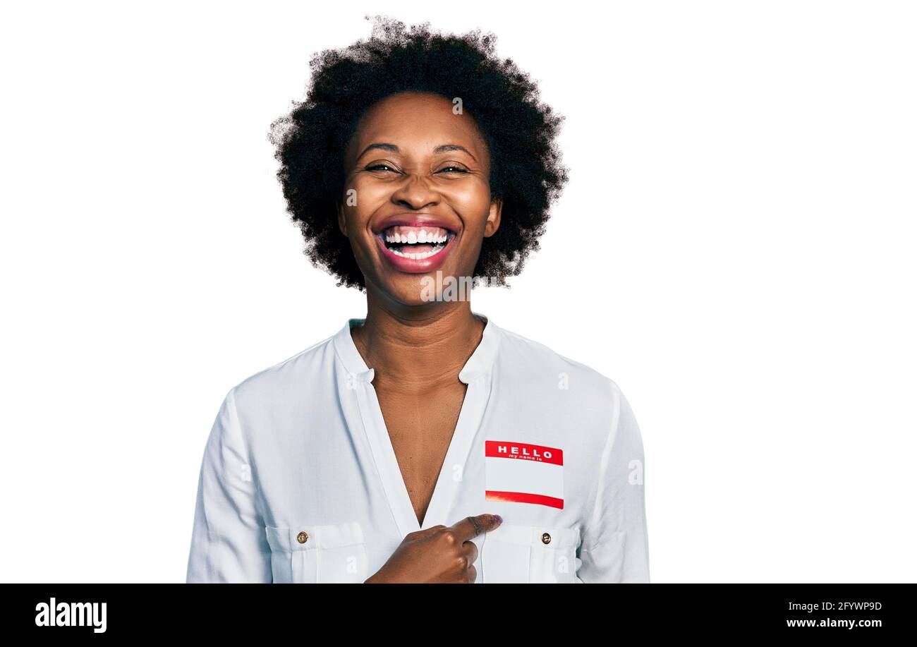 African American Woman With Afro Hair Wearing Hello My Name Is Sticker Identification Smiling And Laughing Hard Out Loud Because Funny Crazy Joke Stock Photo Alamy